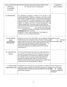 The rationale for this project is to update and improve our outdated Declaration due to changes in Ohio law and adequately reflect our community’s lifestyle and make changes the Bylaws to afford easier and more efficient operation and administration of the community. To assist in your evaluation and understanding of the revised, proposed Amended Declaration and Bylaws, the documents have been “marked up” to show the revisions in 2 categories. Changes that are “required” due to changes in the law or needed to protect the Association are marked in red. All other “lifestyle” issues, changes, and updates are marked in green. We encourage you to carefully read and review the enclosed, updated Amended and Restated Declaration and Bylaws.
